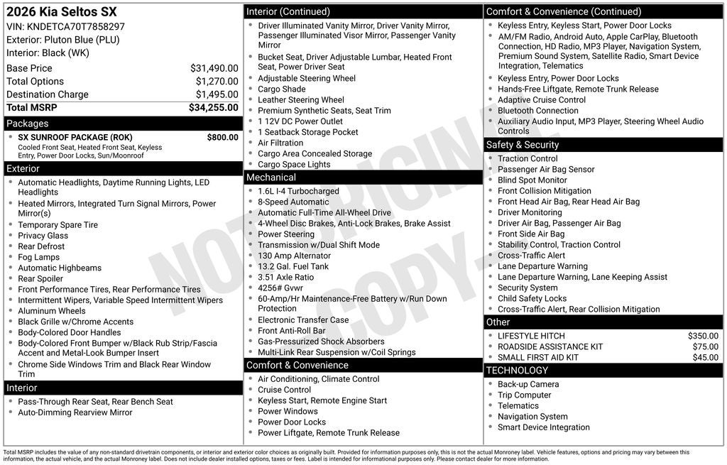AWD 8-Speed Automatic I4 *RECENT ARRIVAL, 4-Wheel Disc Brakes, 8 Speakers, ABS brakes, Air Conditioning, Alloy wheels, AM/FM radio: SiriusXM, Apple CarPlay & Android Auto, Artificial Leather Seat Trim, Auto High-beam Headlights, Auto-dimming Rear-View mirror, Automatic temperature control, Brake assist, Bumpers: body-color, Delay-off headlights, Digital Key, Driver door bin, Driver vanity mirror, Dual front impact airbags, Dual front side impact airbags, Electronic Stability Control, Emergency communication system: 911 Connect, Exterior Parking Camera Rear, Four wheel independent suspension, Front anti-roll bar, Front Bucket Seats, Front Center Armrest, Front fog lights, Front reading lights, Fully automatic headlights, Heated door mirrors, Heated Front Bucket Seats (3-Steps), Heated front seats, Illuminated entry, Leather Shift Knob, Leather steering wheel, Lifestyle Hitch, Low tire pressure warning, Navigation System, Occupant sensing airbag, Outside temperature display, Overhead airbag, Overhead console, Panic alarm, Passenger door bin, Passenger vanity mirror, Power door mirrors, Power driver seat, Power Liftgate, Power steering, Power Sunroof, Power windows, Rear seat center armrest, Rear window defroster, Rear window wiper, Remote keyless entry, Roadside Assistance Kit, Security system, Small First Aid Kit, Speed control, Speed-sensing steering, Split folding rear seat, Spoiler, Sport steering wheel, Steering wheel mounted audio controls, SX Sunroof Package, Tachometer, Telescoping steering wheel, Tilt steering wheel, Traction control, Trip computer, Turn signal indicator mirrors, Variably intermittent wipers, Ventilated Front Seats. Price includes: $1250 - KFA Dealer Choice Program: $1250 discount and 5.25% APR for 36 months. $30.08 per $1000 financed. Available to well qualified buyers who finance through Kia Finance America. 506. Exp. 03/31/2026